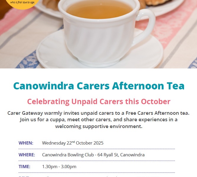 Carer Gateway warmly invites unpaid carers to a Free Carers Afternoon Tea in Canowindra on Wednesday 22rd October at the Canowindra Bowling Club.