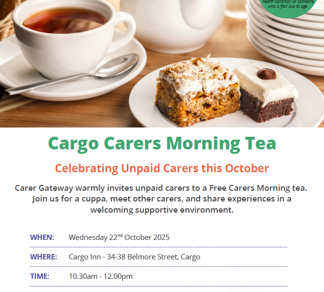 Carer Gateway warmly invites unpaid carers to a Free Carers Morning Tea in Cargo on Wednesday 22nd October at the Cargo Inn.