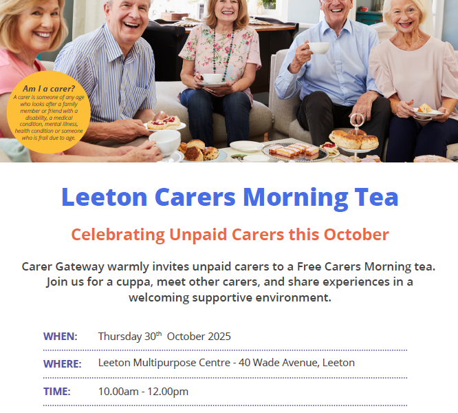 Carer Gateway warmly invites unpaid carers to a Free Carers Morning Tea in Leeton on Thursday 30th October at the Leeton Multipurpose Centre.