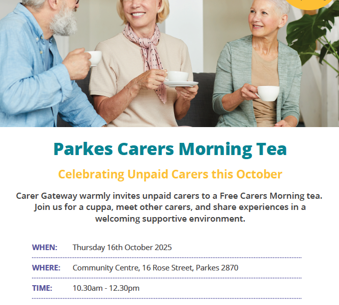 Carer Gateway warmly invites unpaid carers to a Free Carers Week Morning Tea in Parkes on Thursday 16th October at the Rose Street Community Centre.