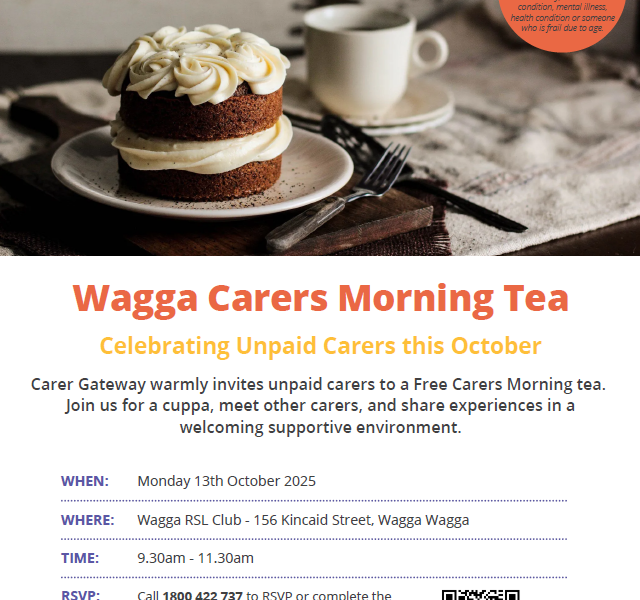 Carer Gateway warmly invites unpaid carers to a Free Carers Morning tea in Wagga Wagga on Monday 13th October at the Wagga RSL.