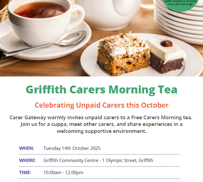Carer Gateway warmly invites unpaid carers to a Free Carers Week Morning Tea in Griffith on Tuesday 14th October at the Griffith Community Centre.