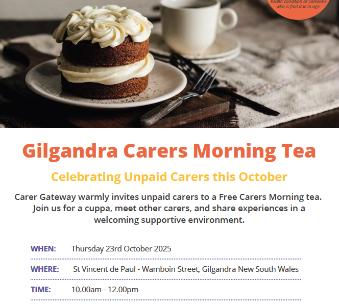 Carer Gateway warmly invites unpaid carers to a Free Special Morning Tea in Gilgandra on 23rd of October at the Gilgandra Vinnies 86 Wamboin St, Gilgandra